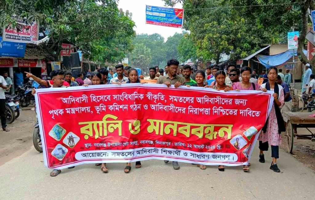 দিনাজপুরের নবাবগঞ্জে ১৬ দফা দাবিতে র্যালি ও মানববন্ধন করেছে আদিবাসী শিক্ষার্থী ও সাধারণ আদিবাসীরা। সোমবার ১২ আগষ্ট দুপুরে সমতলের আদিবাসী শিক্ষার্থী ও সাধারণ আদিবাসীদের আয়োজনে উপজেলা পরিষদ চত্বর থেকে একটি র্যালি উপজেলার প্রধান প্রধান সড়ক প্রদক্ষিন করে।