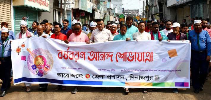 এরই ধারাবাহিকতায় দিনাজপুর জেলা প্রশাসনের আয়োজনে সোমবার (১৪ এপ্রিল ২০২৫ খ্রি.) সকাল-০৮.৩০ ঘটিকায় পহেলা বৈশাখ উদযাপন উপলক্ষে “বর্ষবরণ আনন্দ শোভাযাত্রা” দিনাজপুর একাডেমী উচ্চ বিদ্যালয় হতে বের হয়ে শহরের বিভিন্ন স্থান প্রদক্ষিণ শেষে গোর-এ শহিদ ময়দান (বড়মাঠ)-এ সমাপ্ত হয়।